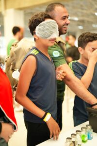 O estande da oficina Explorando Sentidos também ficou lotado. A atividade convidou o público a vivenciar diferentes percepções sensoriais por meio da privação de alguns sentidos. O público se divertiu ao testar o tato de olhos vendados, tentando adivinhar os objetos que tocavam, e ao exercitar o olfato, identificando aromas.